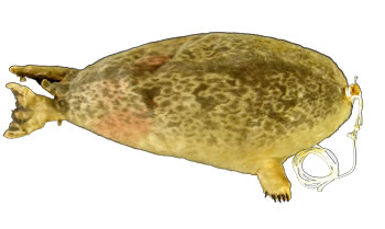 Seal-gut parka made by Neva Rivers from the intestines of a single bearded seal, with a wide hem made to fit snugly over the kayak's cockpit coaming.